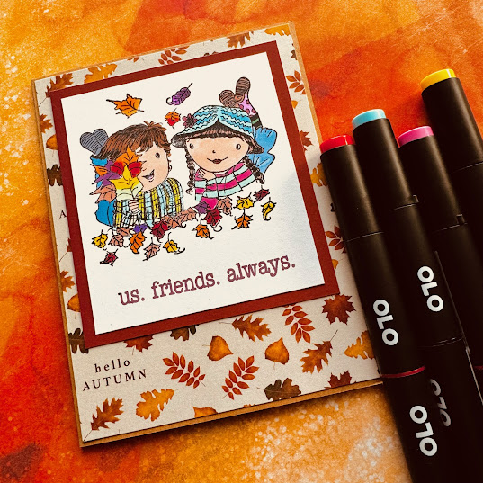 I bought myself some OLO markers for my birthday and have been trying them out . They are alcohol markers, like COPICS or Ohuhu, but the similarity ends there. Check out the fantastic OLO website for all the information on these markers. I love to color and wanted to challenge myself, so I asked a friend to do a blog post with me, each using our OLO markers. Terri Burson of Waving My Wand is a fantastic paper-crafter with amazing coloring skills . So we each made a Fall-themed card with our OLOs. Thanks to Terri for our fun graphic !!